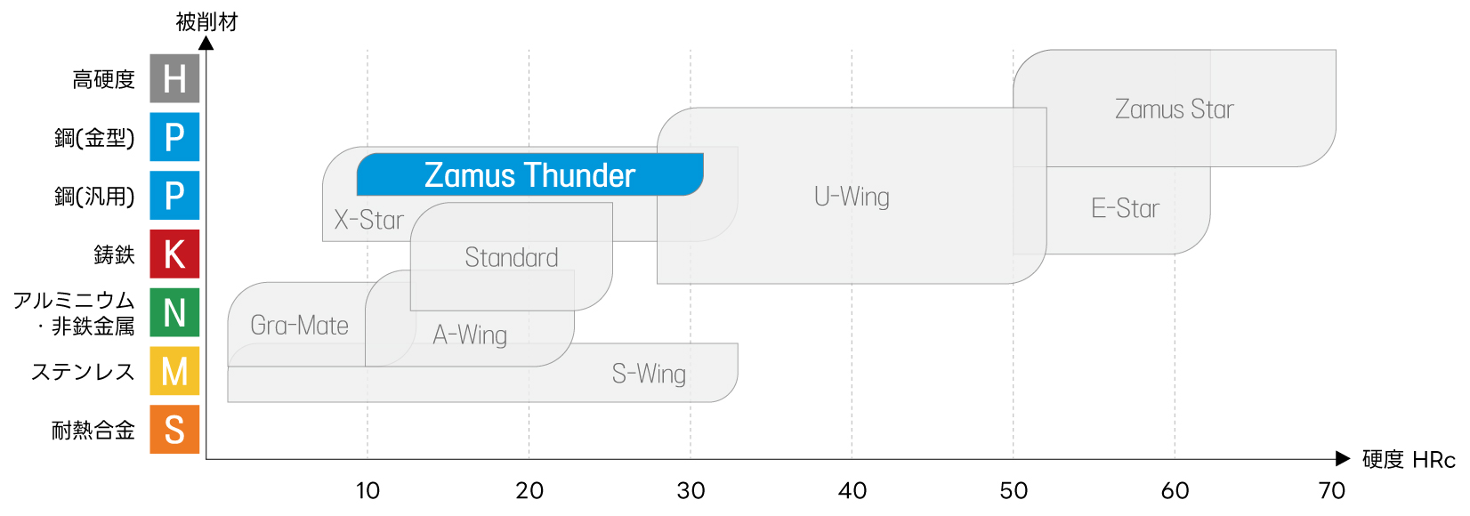 合金鋼から炭素鋼、プレハードン鋼、熱処理鋼などの低硬度(推奨:HRc10~30) 被削材加工に最適