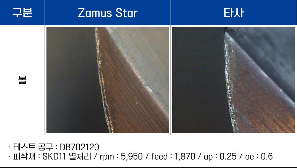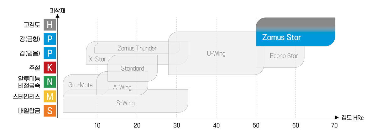 - 열처리강 및 합금강, 탄소강 등의 고경도 피삭재 (추천 : HRc 50 ~ 70)의 고속가공에 적합