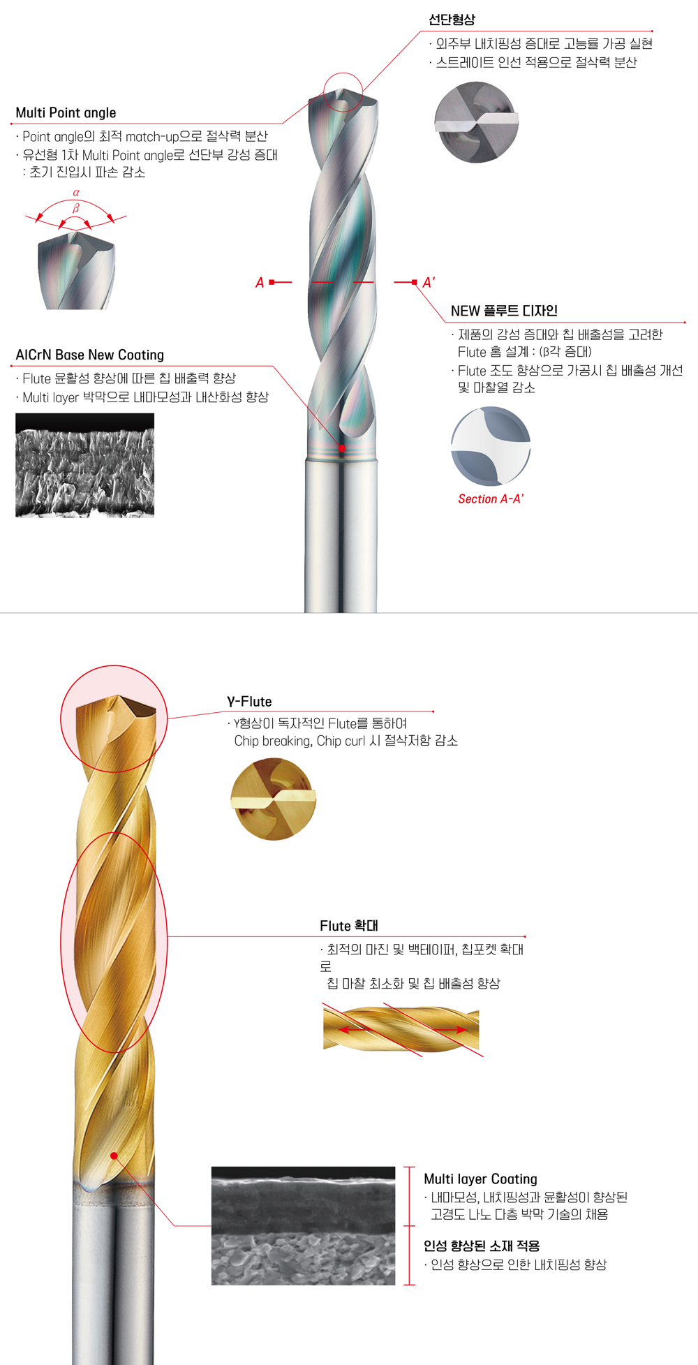 - 절삭성 향상, 안정적인 칩 배출로 선단 절삭부하 감소 및 가공 면조도 향상